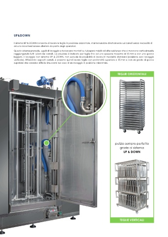 Il sistema UP & DOWN consente di lavare le teglie in posizione orizzontale, mantenendole direttamente sui carrelli senza necessità di