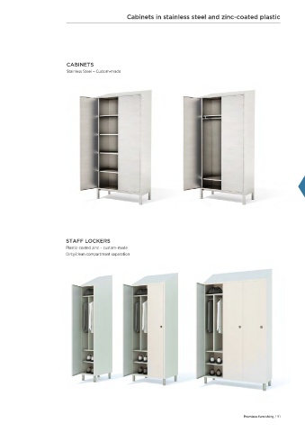 Cabinets in stainless steel and zinc-coated plastic CABINETS Stainless Steel – Custom-made STAFF LOCKERS Plastic-coated zinc – custom-made Dirty/clean compartment separation Premises furnishing / 91