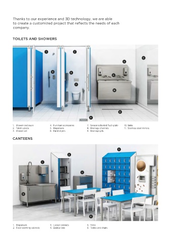2. Toilet cubicle 5. Dispensers 8. Drainage channels 11. Stainless steel mirrors