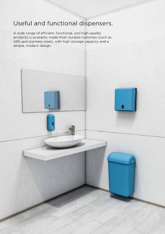 Useful and functional dispensers. A wide range of efficient, functional, and high-quality products is available, made from durable materials (such as ABS and stainless steel), with high storage capacity and a simple, modern design.
