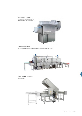 WASHING TUNNEL Compact size, dual speed, washes and rinses up to 180 crates/hour CRATE WASHER For continuous washing of small and medium-sized containers and crates SANITIZING TUNNEL With UV lamp Sanitization and cleaning / 125