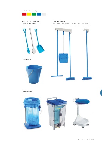 Available in the following colors: PADDLES, LADLES, TOOL HOLDER AND SHOVELS 3 slots - l 540 - w 126 - h 200 mm / 1 slot - l 156 - w 126 - h 140 mm BUCKETS TRASH BIN Sanitization and cleaning / 129