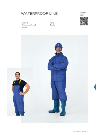 WATERPROOF LINE Complete product range: • Helmet • Pants • Waterproof mask • Boots • Jacket Sanitization and cleaning / 137