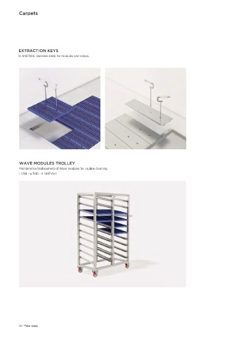 Carpets EXTRACTION KEYS In AISI 304L stainless steel, for modules and ramps. WAVE MODULES TROLLEY Maintenance/replacement of Wave modules for routine cleaning l 1.154 - w 540 - h 1.657 mm 28 / Filter areas