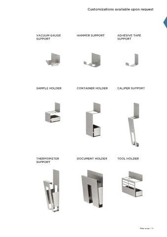 Customizations available upon request VACUUM GAUGE HAMMER SUPPORT ADHESIVE TAPE SUPPORT SUPPORT SAMPLE HOLDER CONTAINER HOLDER CALIPER SUPPORT THERMOMETER DOCUMENT HOLDER TOOL HOLDER SUPPORT Filter areas / 35