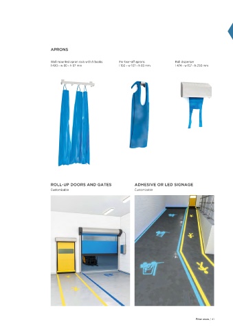 APRONS Wall mounted apron rack with 5 hooks For tear-off aprons Roll dispenser l 490 - w 80 - h 97 mm l 150 - w 107 - h 83 mm l 474 - w 157 - h 250 mm ROLL-UP DOORS AND GATES ADHESIVE OR LED SIGNAGE Customizable Customizable Filter areas / 41