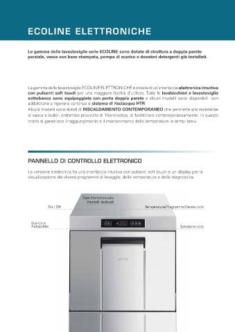 La gamma delle lavastoviglie ECOLINE ELETTRONICHE è dotata di un’interfaccia elettronica intuitiva Alcuni modelli sono dotati di DUAL HEATING che permette alle resistenze di vasca e boiler, entrambe